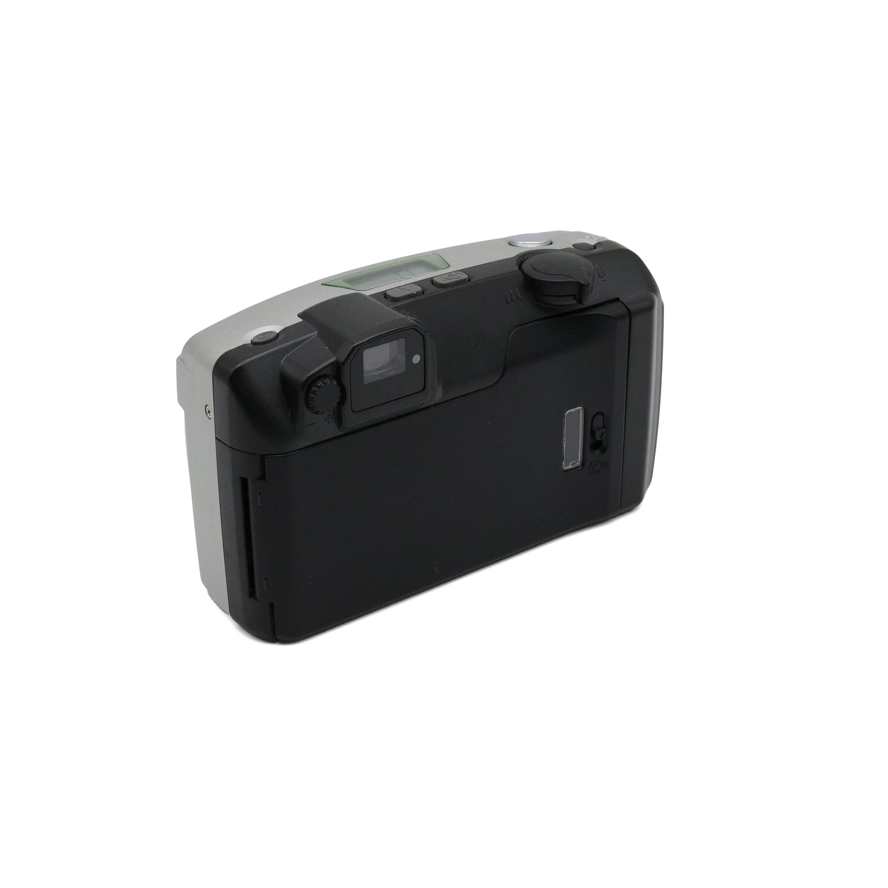 It features a 38-105mm zoom lens and a wide range of flash modes, the red-eye reduction function has a separate button. A self-timer function is also included, as well as a Bulb mode. All switched functions are showed on an LCD display on top of the camera, this also shows battery condition and frame number.