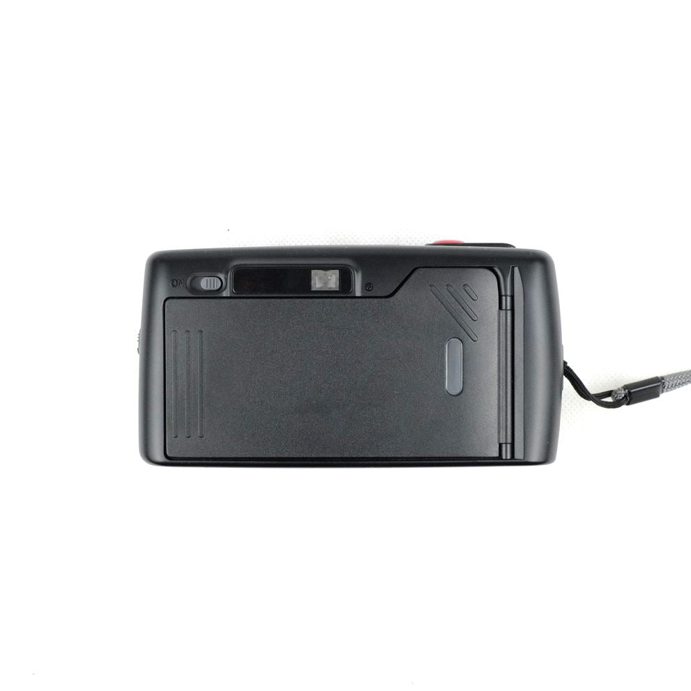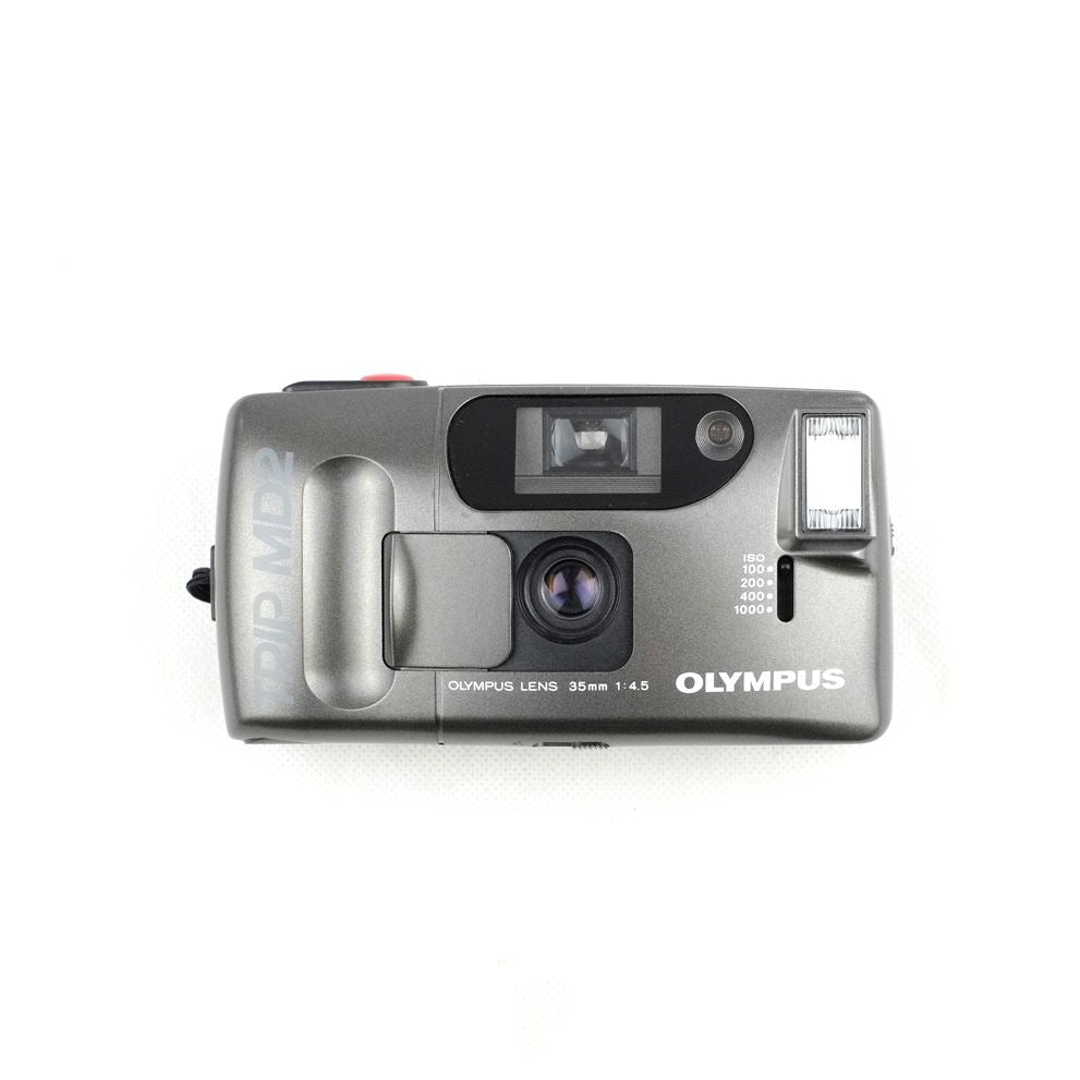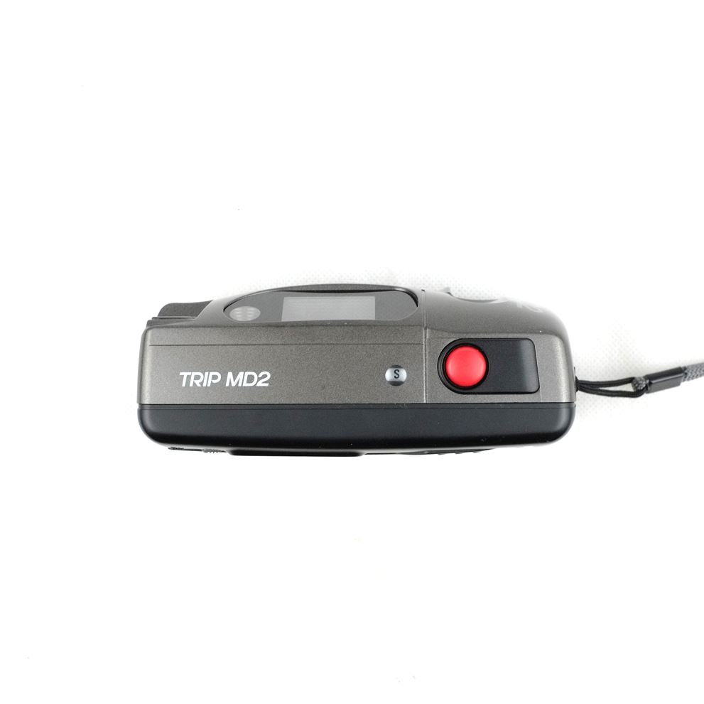 The OLYMPUS Trip MD2, is a fully-automatic 35mm compact camera, with motor drive and fixed focus - manufactured by Olympus. It was one of a series of cheap fixed focus models branded Olympus Trip. It had a "distance focus" button on the bottom marked with the mountains icon. This was used for photographing landscapes with a small aperture.