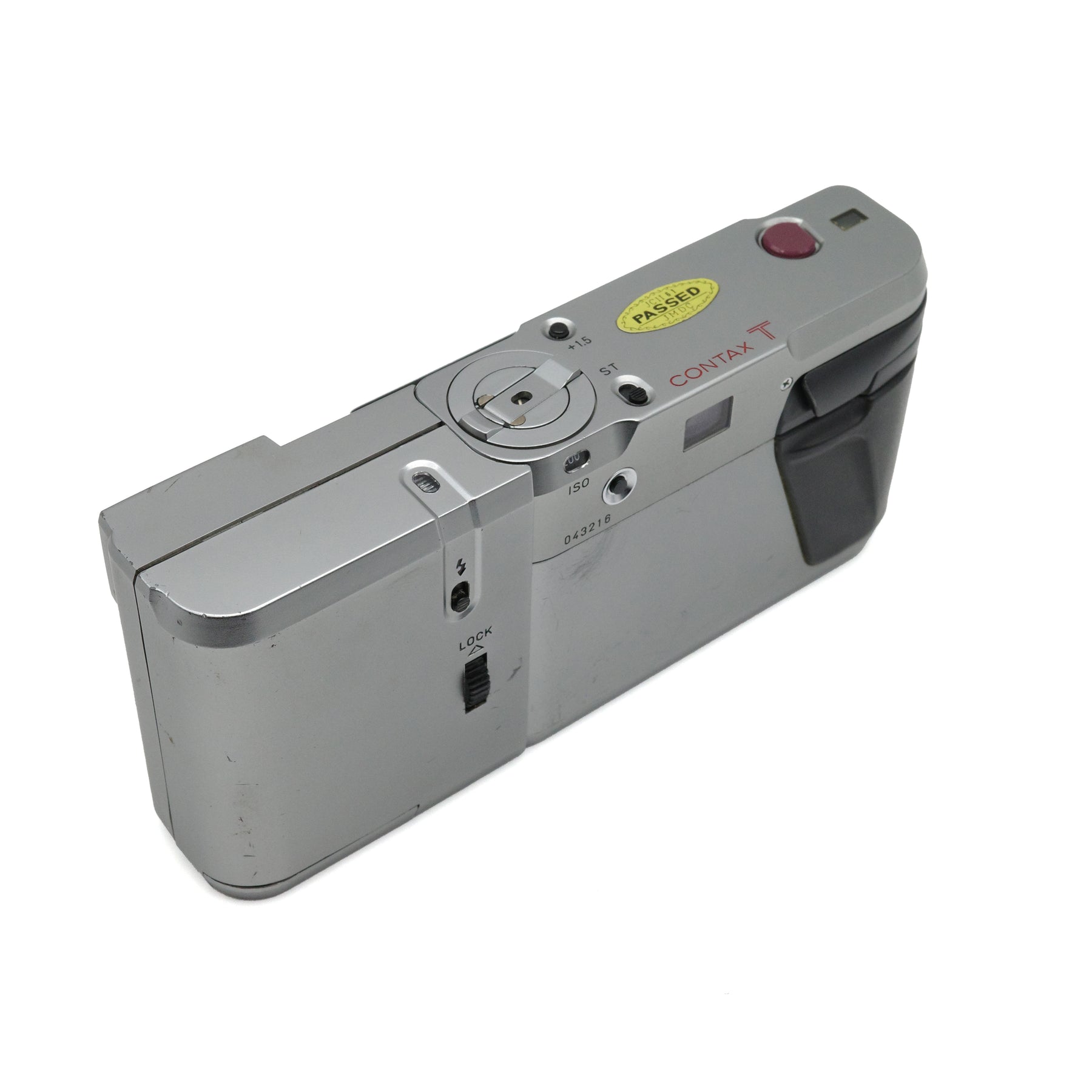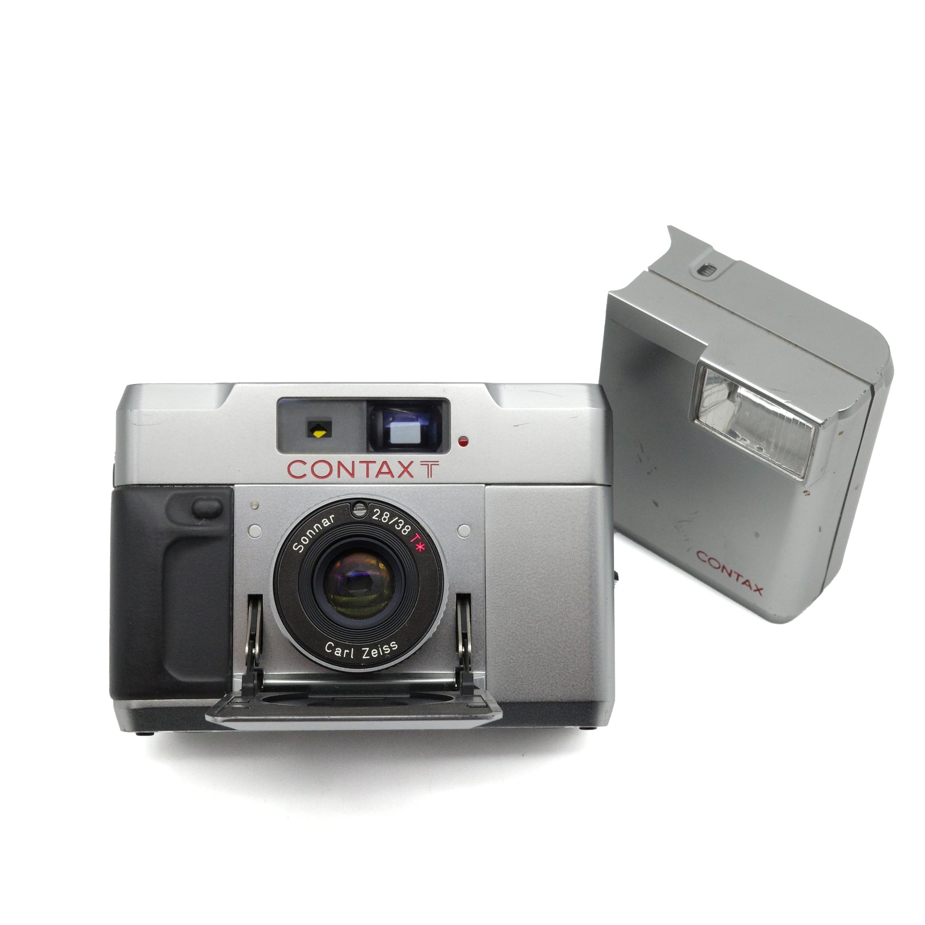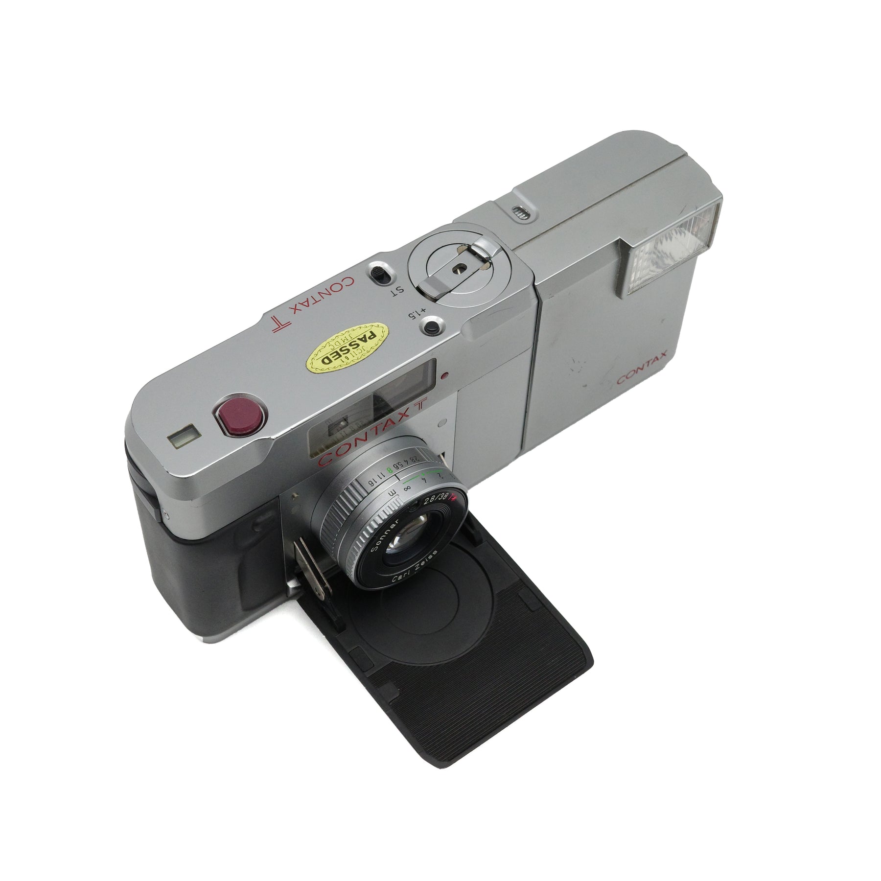 The fisrt Contax T – with 5-element Carl Zeiss Sonnar T* 38 mm manual focus lens (made by Yashica, which was owned by Kyocera, in partnership with Carl Zeiss). Introduced in 1984. Includes a dedicated separate clip-on auto flash (A14).