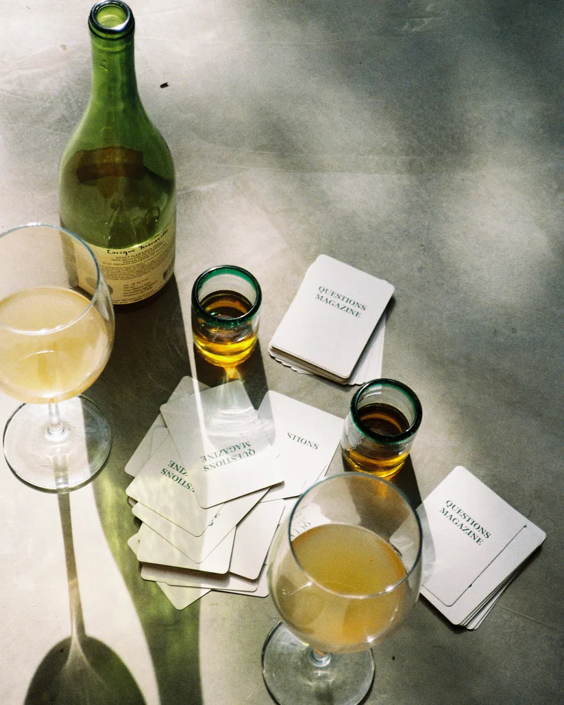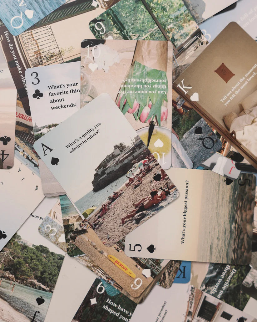 A poker card set designed with analog photos and thought provoking questions to spark meaningful conversations.